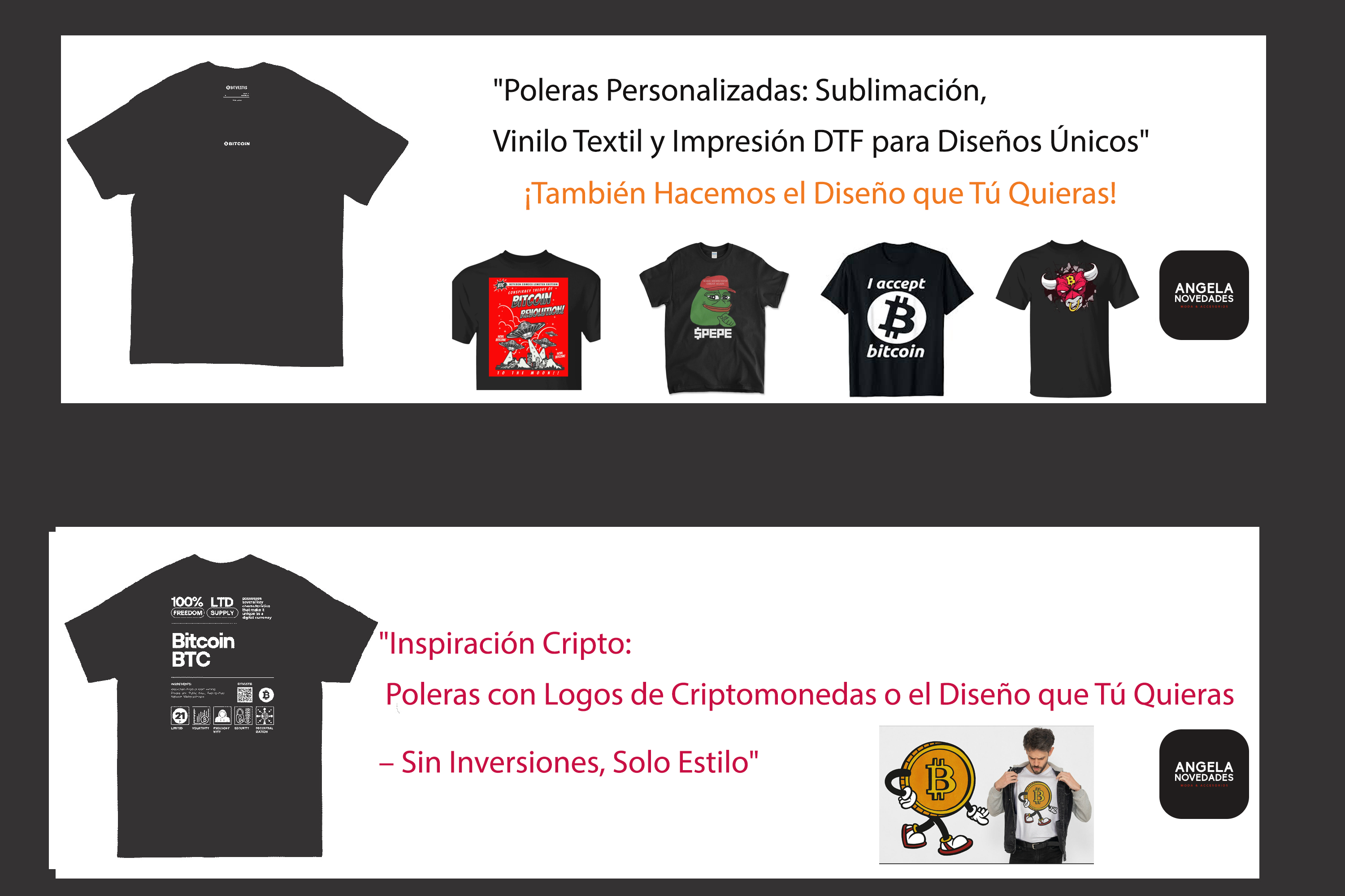 Ver enlace...**"Bienvenido a Angela Novedades, tu destino online para la moda más actual. Nuestra tienda está especializada en poleras inspiradas en el mundo de las criptomonedas, pero también ofrecemos una amplia variedad de ropa y accesorios para todos los gustos. Desde estilos urbanos hasta opciones más elegantes, en Angela Novedades encontrarás todo lo que necesitas para expresar tu personalidad a través de la moda. Explora nuestra colección y descubre prendas únicas que combinan tendencia y originalidad.